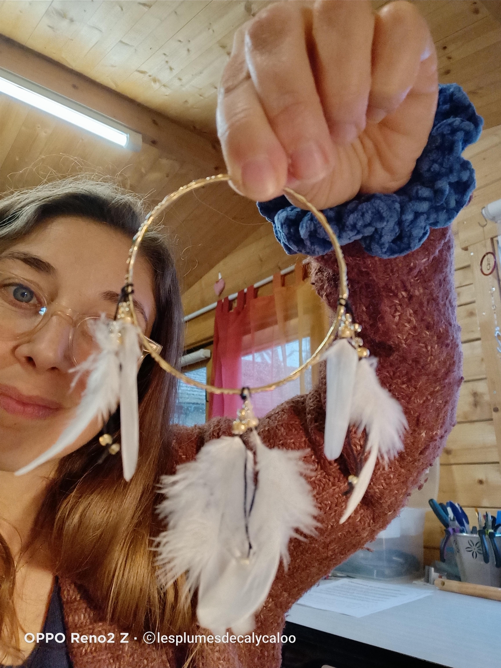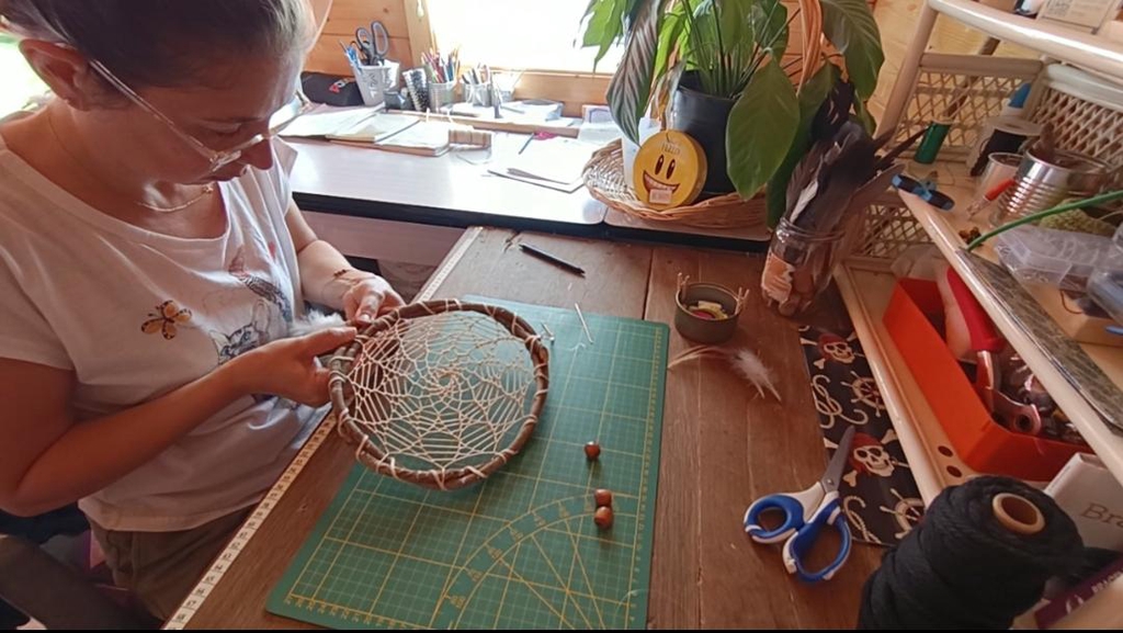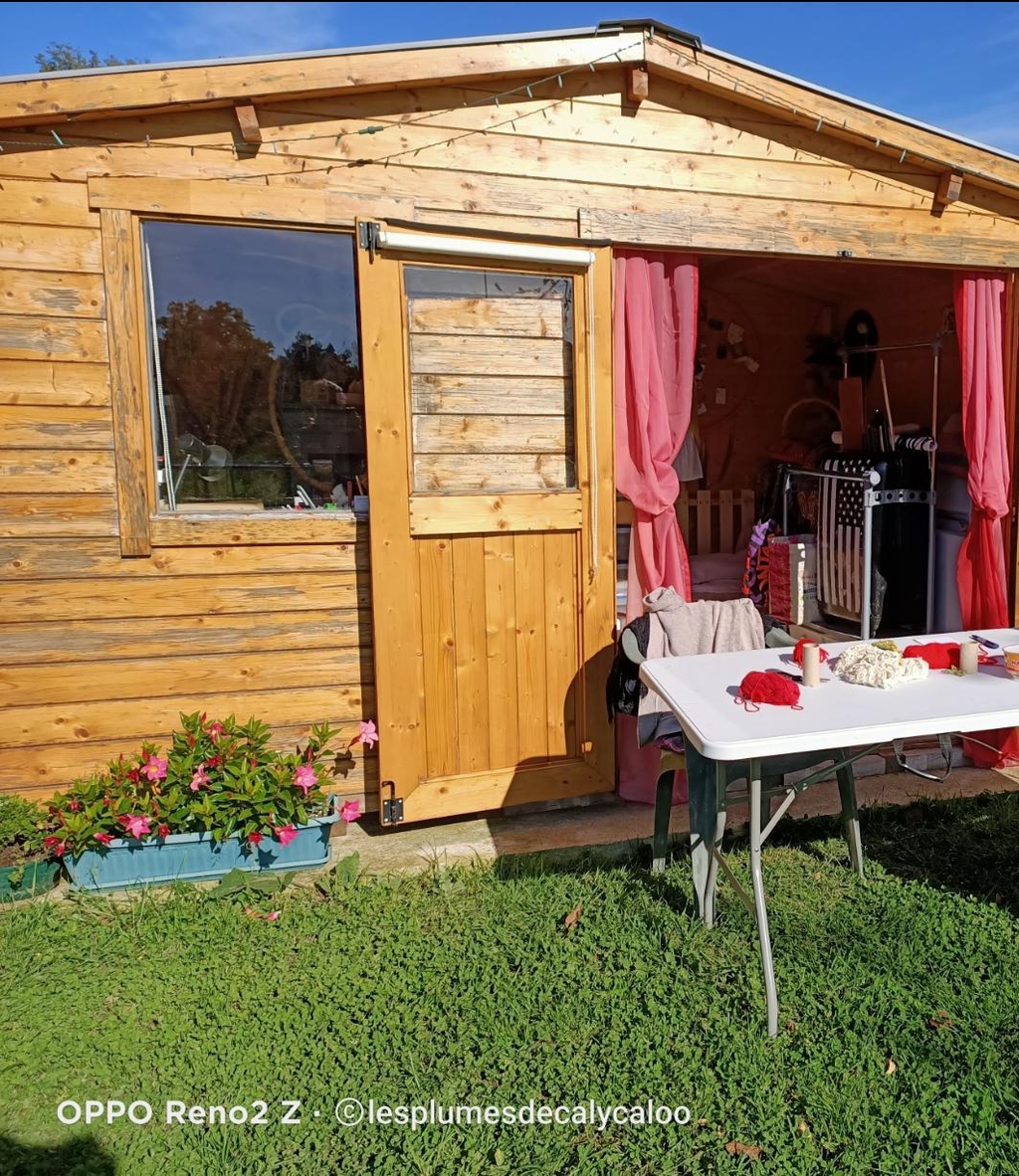 Et comme j' ai la créativité qui déborde parfois je vais plus loins et naissent des "petits plus" des petits accessoires allant du bracelets de perles en bois au marque page en papier recyclé avec toujours ma petite note de breloque ou de plume qu on retrouve dans mes créations tout comme le tissage divers de fils de coton. Je créer quand il me chante et non a la chaîne puisque j' ai aussi un emploi qu on peut appeler aussi emploi alimentaire dans le service a la personne et une famille donc je peu passer plusieurs semaines sans créer comme être très présente a l atelier , tiens d ailleurs l atelier, ouiii J ai commencé par la petite caravane au fond du jardin, que j' ai adorai mais qui trop exiguë et en mauvaise état on a remplacé. C est donc au cours de la fin d hiver 2024 que nous avons oeuvré a la construction d un petit chalet en bois, plus de place pour entasser et confectionner mes trésors. Dans un écrin de verdure puisque dans mon jardin a la campagne.