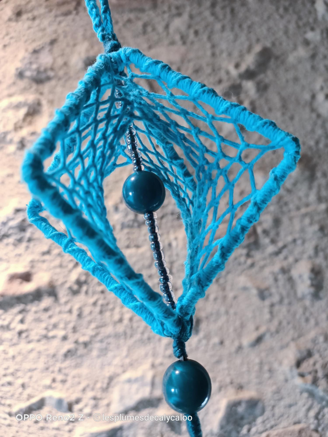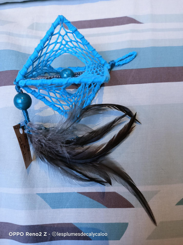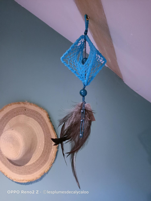Attrape rêves 3D réalisé sans colle. Deux carrés métallique de 10cm venant d anciens abat-jour, habillés et tissés de fils de coton bleu azur. Agrementé au centre d une ligne de perles de rocail et d une grosse perle assortie a l effet nacré, les mêmes perles sont utilisés en bas avec un houpet de plumes véritables de queue de coq, noir.