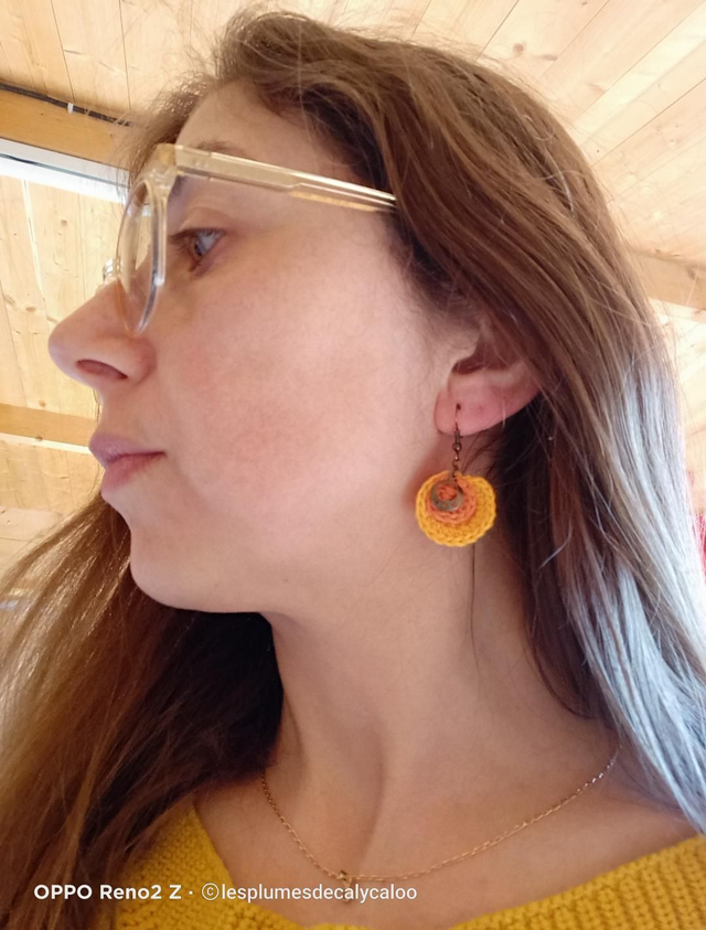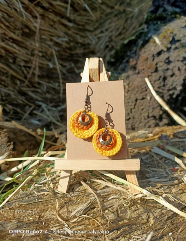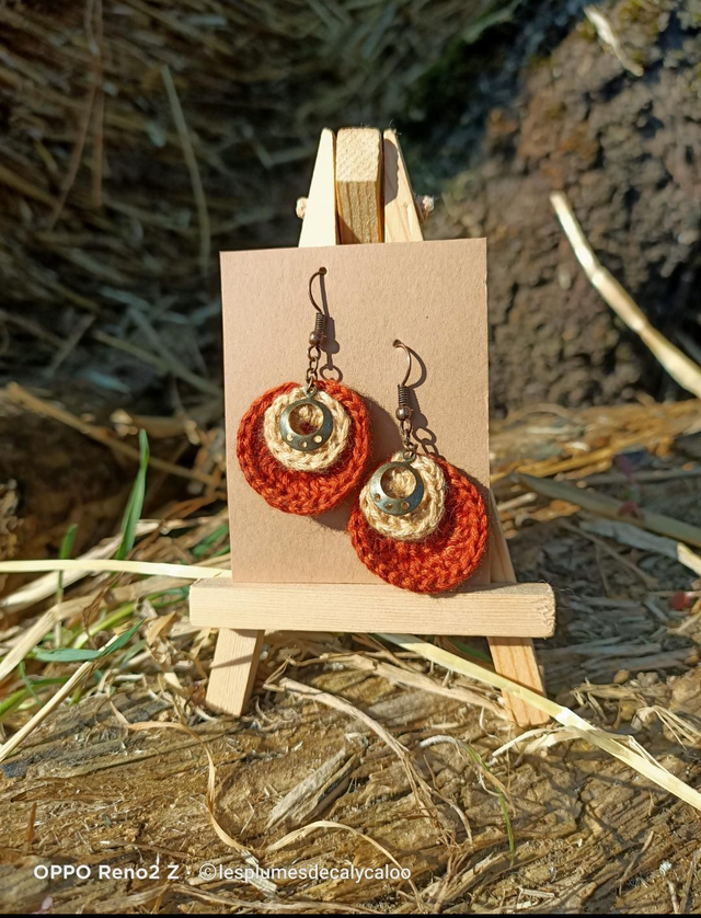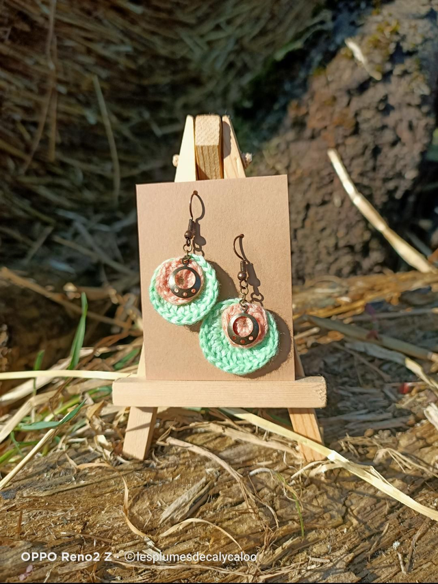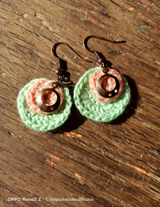Boucles d oreilles fait a la main au fil a broder, superposition de deux disques au crochet et agrémenté de breloque en laiton également montées sur des crochets d oreilles en laiton couleur cuivré vieilli.