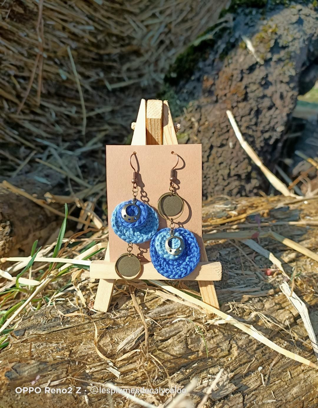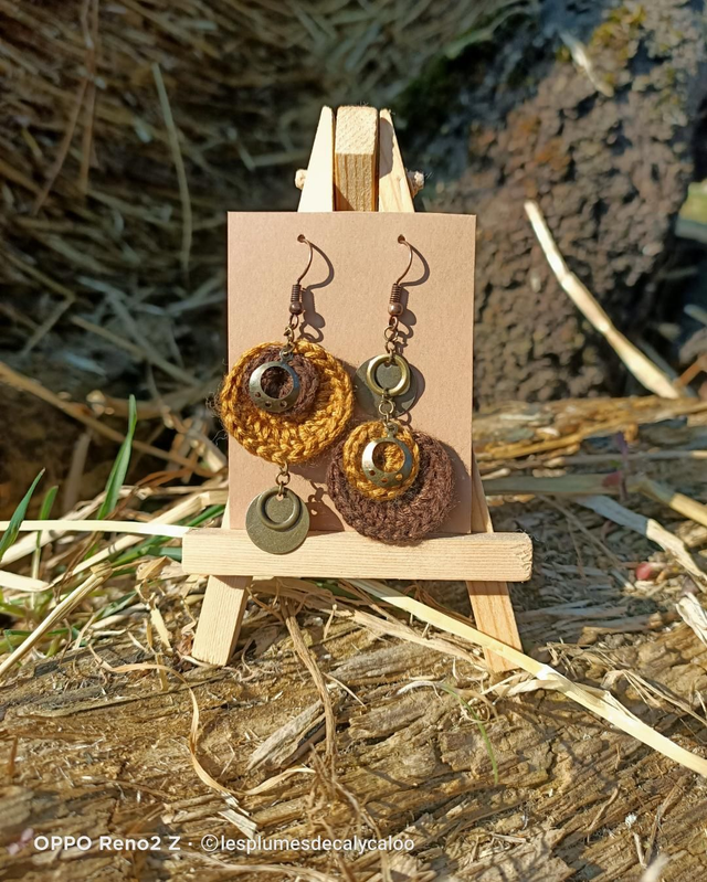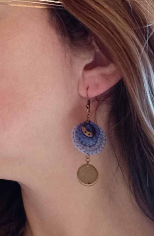 Faite a la main et au fil a broder crocheté deux disques superposes agrémenté de breloque en laiton disposé a l invers. Montées sur des crochets d oreilles en laiton couleur cuivré vieilli.