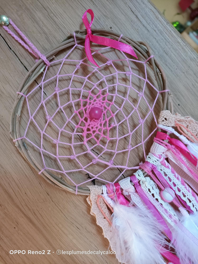 Attrape rêves réalisé sur bois de glycine tressé. Diamètre approximatif de ** cm, hauteur hors attache de **cm. Attrape rêves modèle unique, confectionné a la main et sans colle .