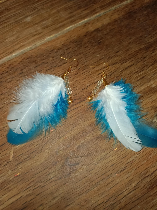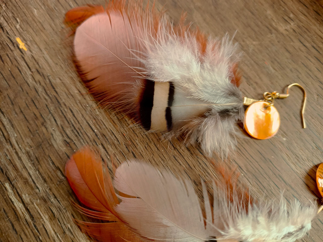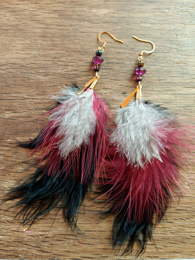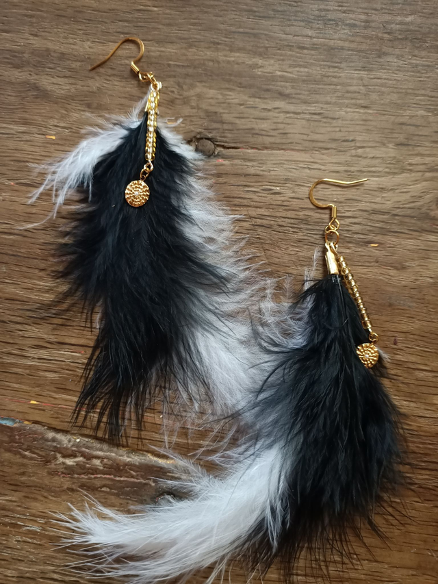 Boucles d'oreilles élégantes de 12 à 15 cm selon modèles, acier inoxydables dorés et plumes. Chaque modèles est unique.