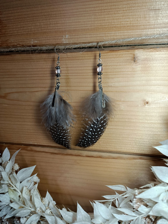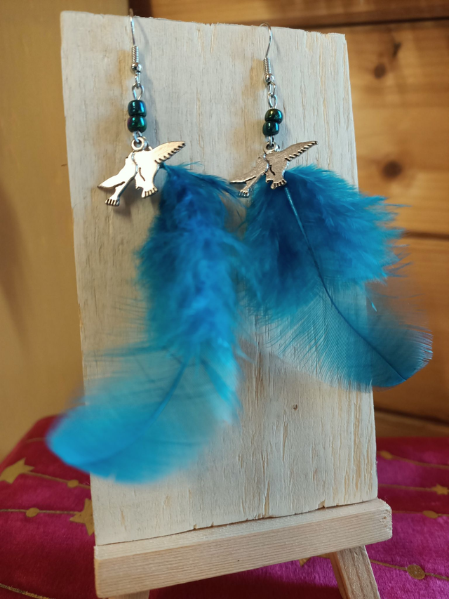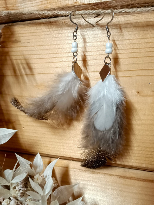 Boucles d'oreilles élégantes en acier inoxydables et plumes démentions entre 12 et 15cm selon modèles. Chaque paires et un modèles unique.