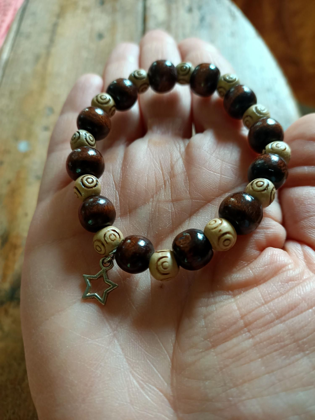 Perles de bois foncé et des plus petites pyrogravées claires montées sur élastique.