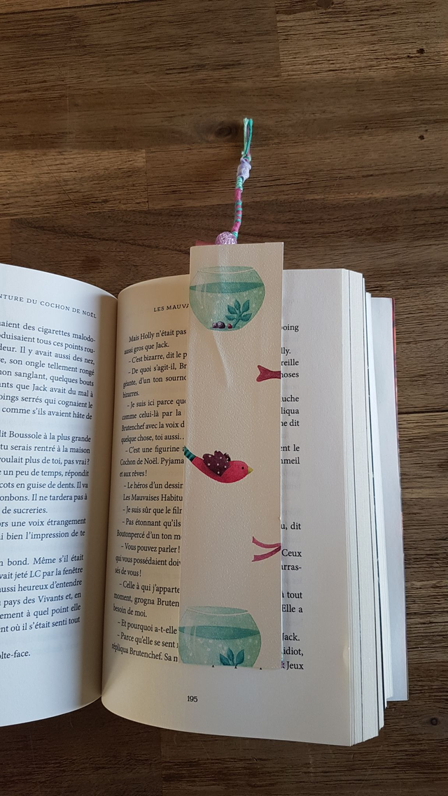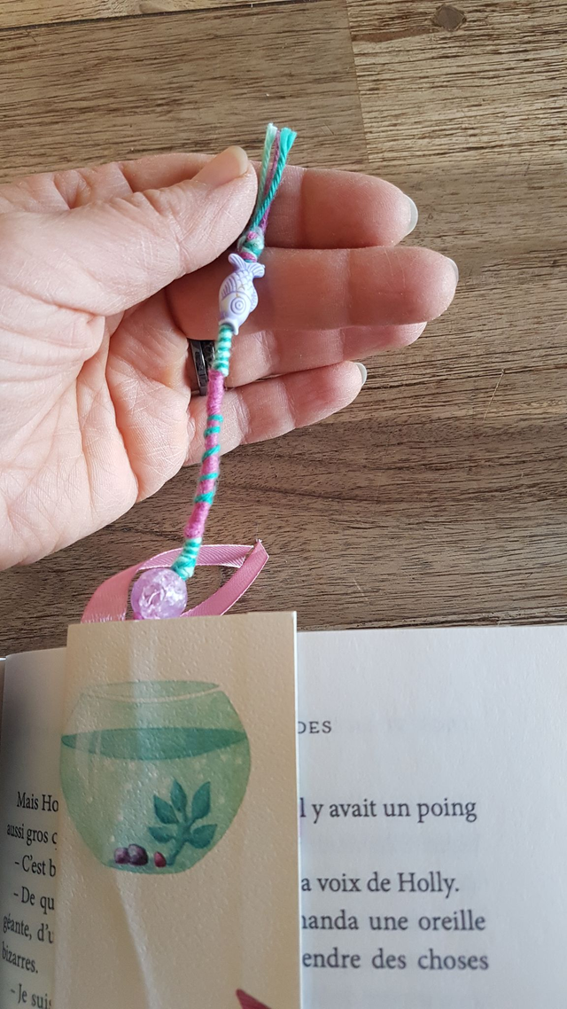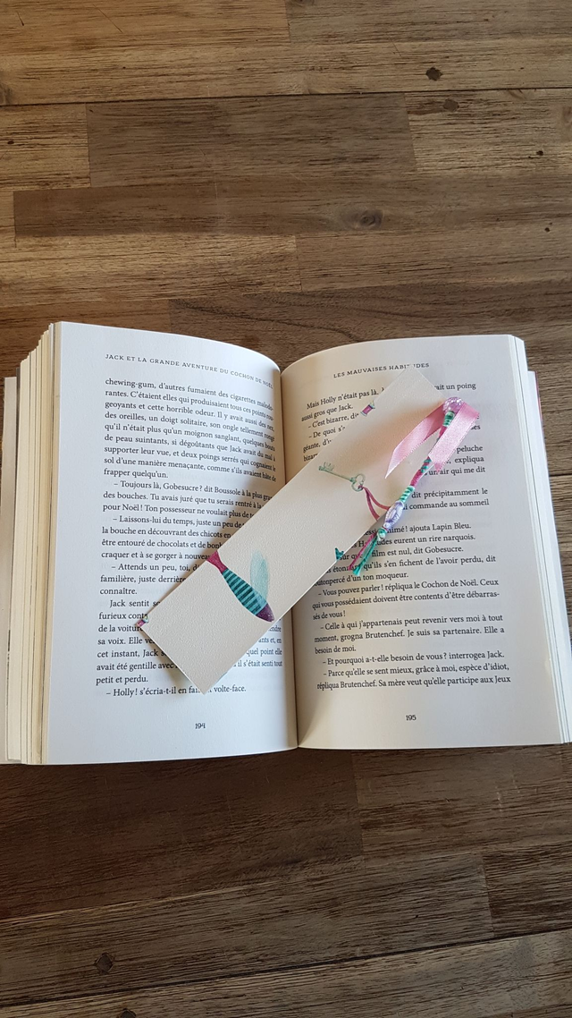 Les "marques ta page" sont les seules créations des plumes de calycaloo à contenir de la colle. Un papier épais décor, un ruban rose, une petite fantaisie en coton tissé a la main aux couleurs assorties au décor du papier, démarré par une perle fantaisie et terminé par un petit poisson.