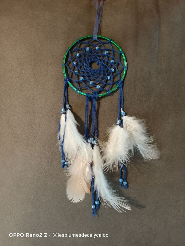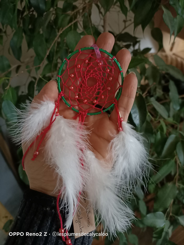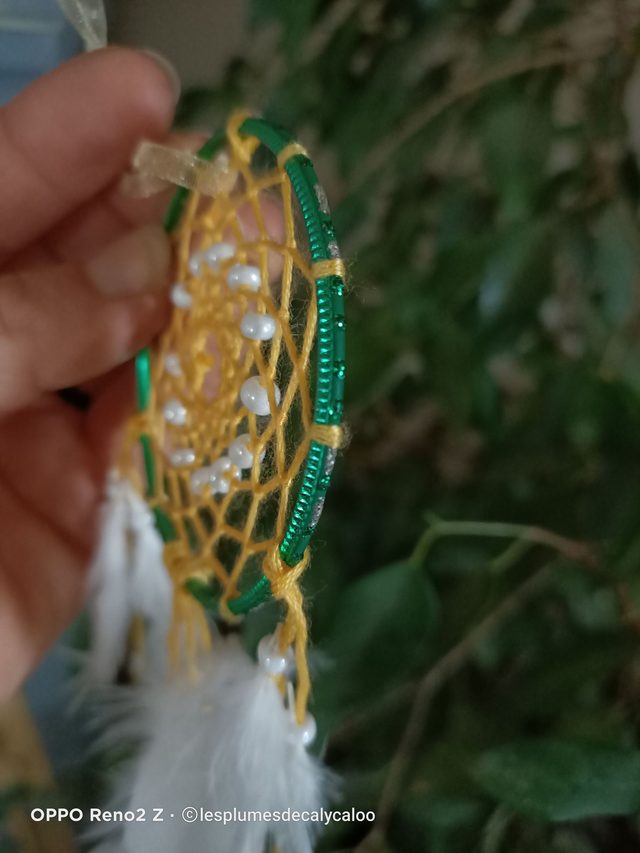 minis attrape rêve unique par leur couleurs de la série TOUT EN COULEURS crée d 'un bracelet métallique vert a paillettes argentées et reliefs, un fils satiné décliné en 4 coloris et orné avec des plumes de duvet véritables. Diamètre 6cm hauteur hors attache de 16 à 19cm suivant le coloris.
